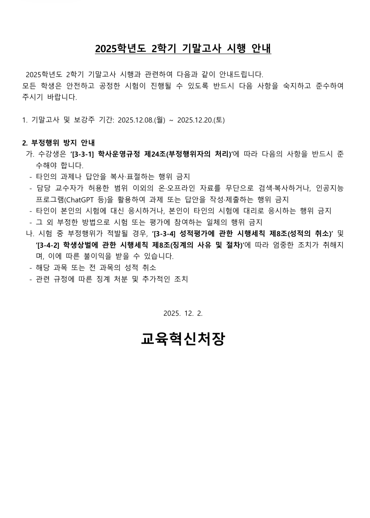 2025학년도 2학기 중간고사 및 기말고사 시행 안내
